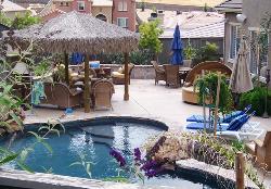| Tropical outdoor living with an flagstone patio and sitting wall . Click on picture to see other current porjects. |